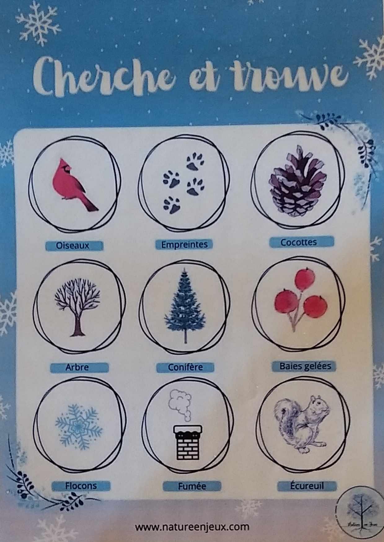 Ayant pour mission de trouver les 9 éléments du "cherche et trouve" de l'hiver, de chercher les traces des animaux dans la neige et de s'amuser!