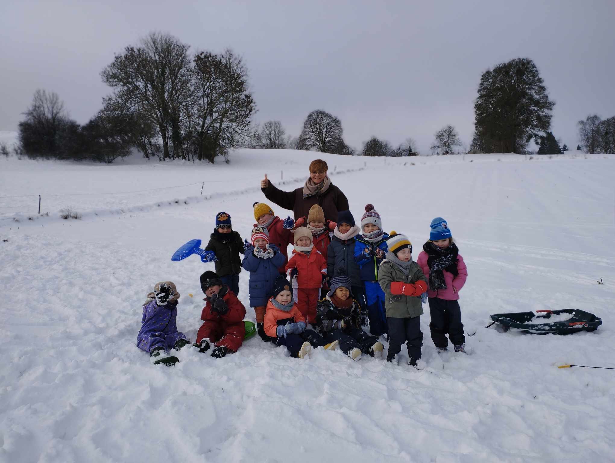 Dans le cadre de l'école du dehors, les enfants ont envahi le champ de culture qu'ils observent chaque semaine avec luges, pelles, moules, loupes, petites voitures,...