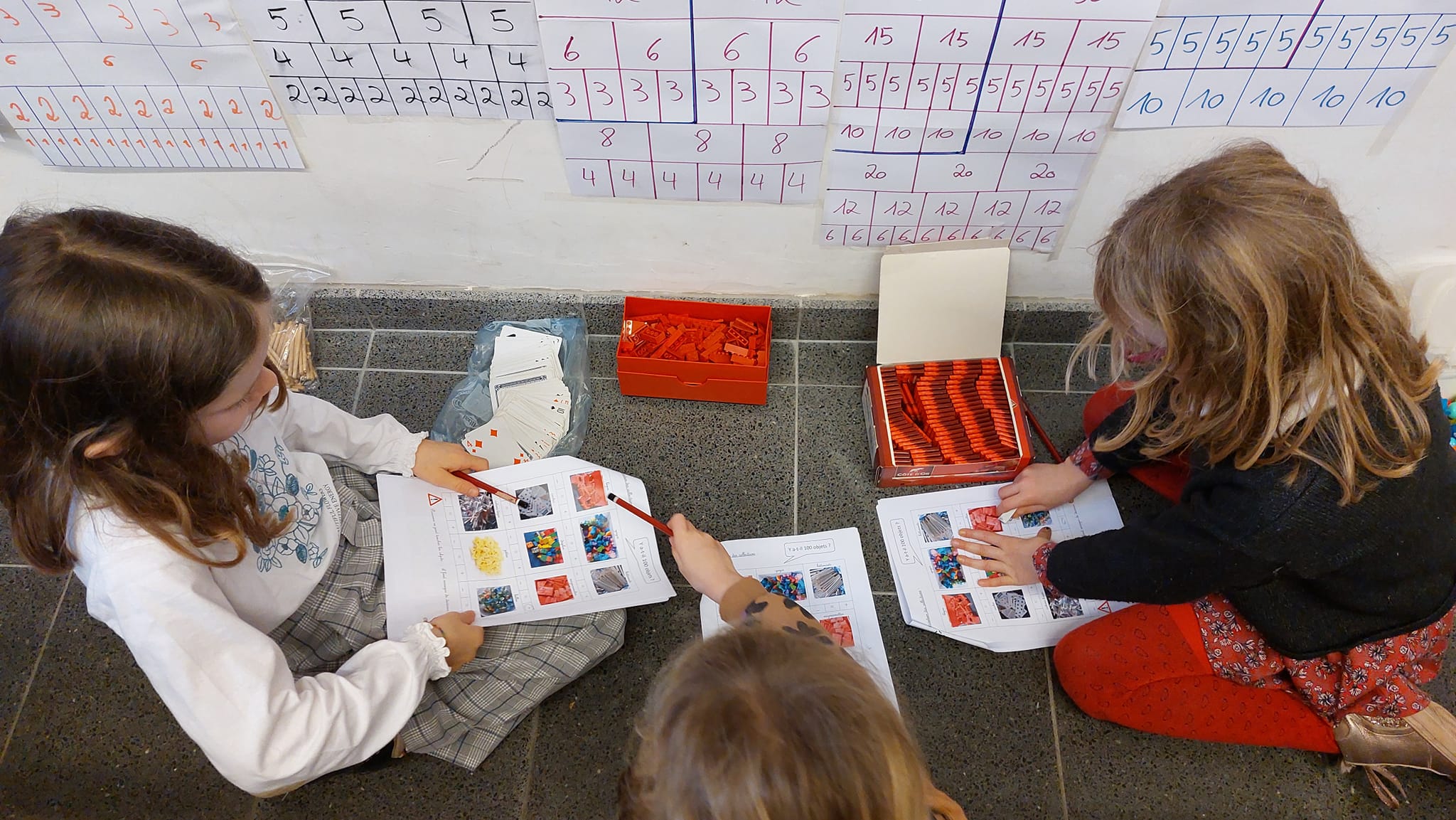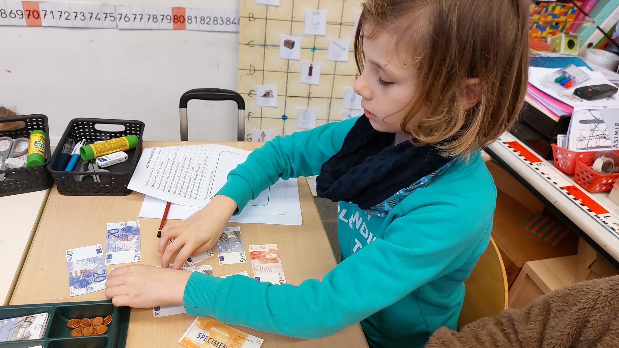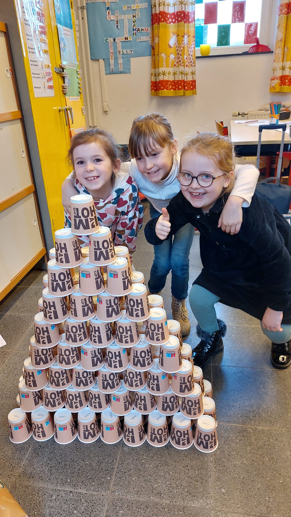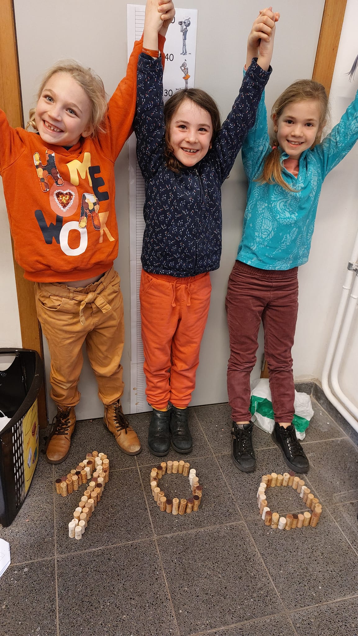Ce 15 février était le 100e jour d'école. L'occasion pour les 2e année d'aborder le nombre 100, au programme de ce cycle. De nombreux défis à relever : mesurer 100m, payer 100€, construire des tapis de 100 cubes ou des châteaux de 100 gobelets, former le nombre 100 avec 100 bouchons, estimer des quantités <, >, ou = à 100... et bien d'autres choses encore!