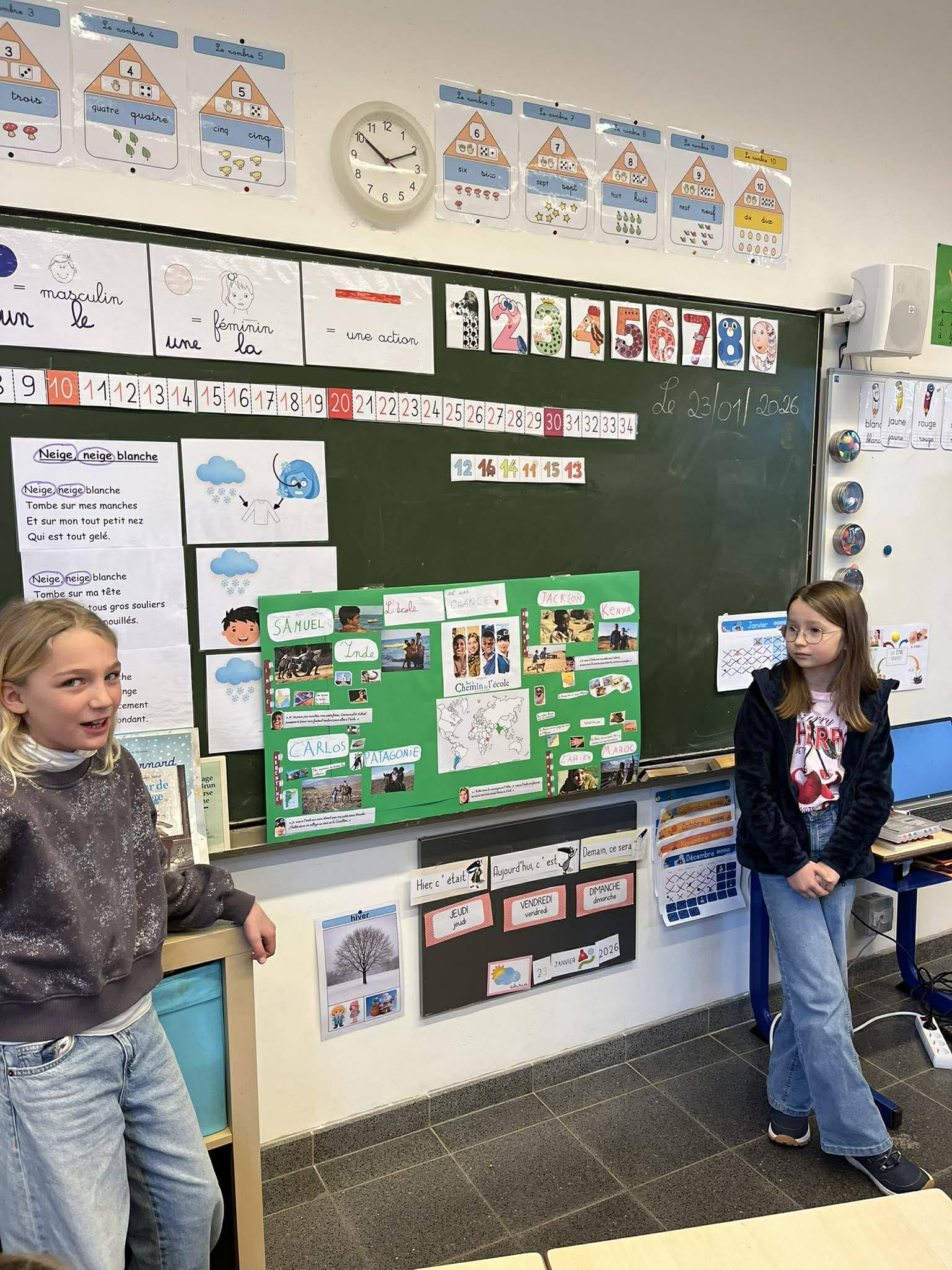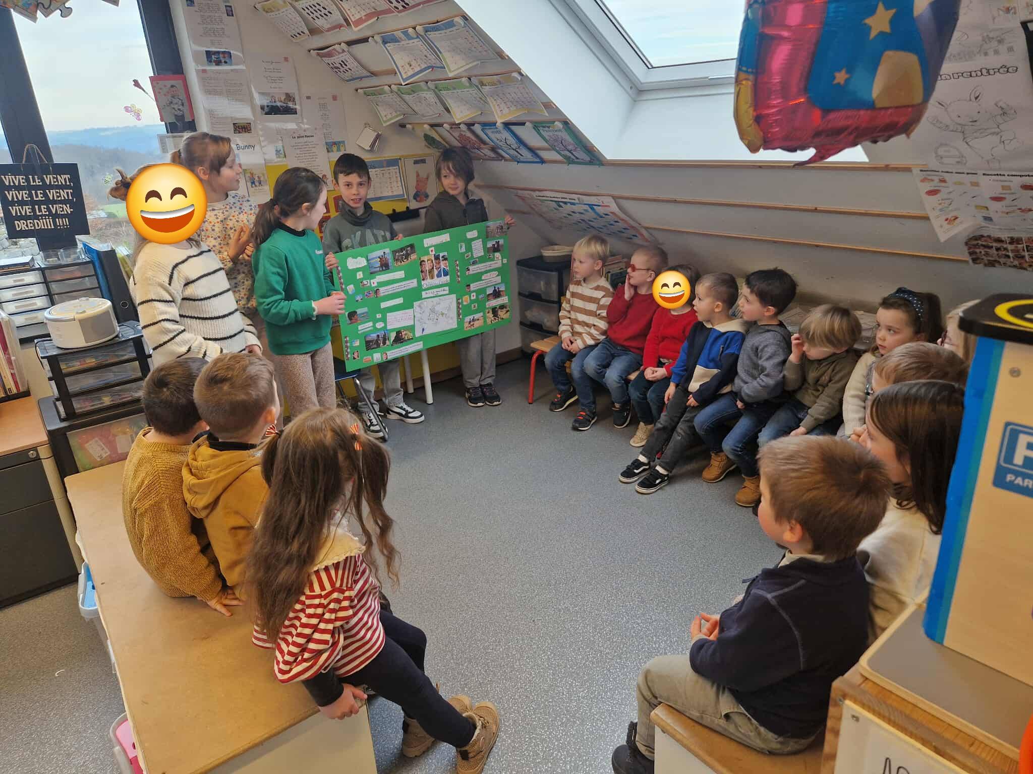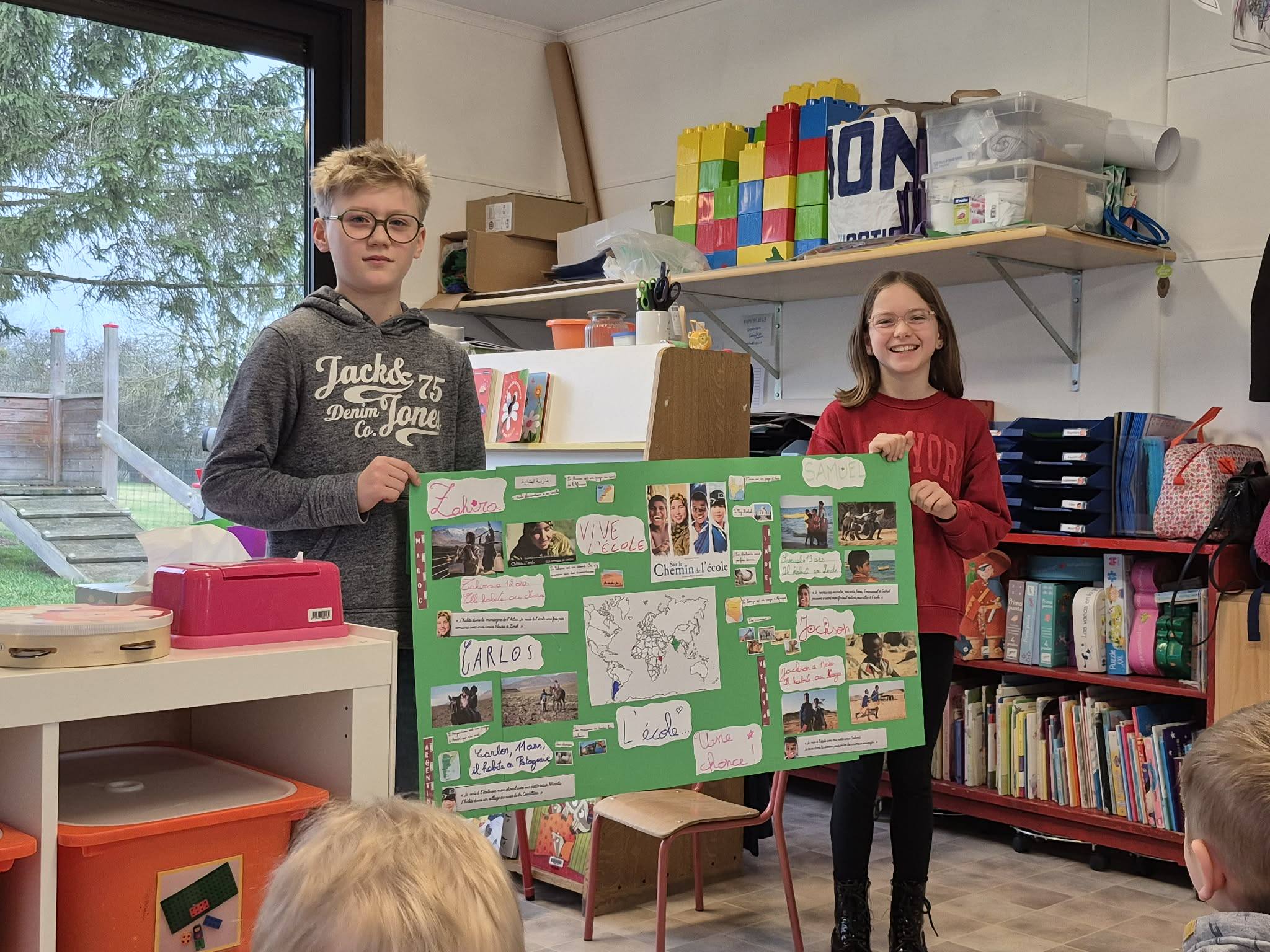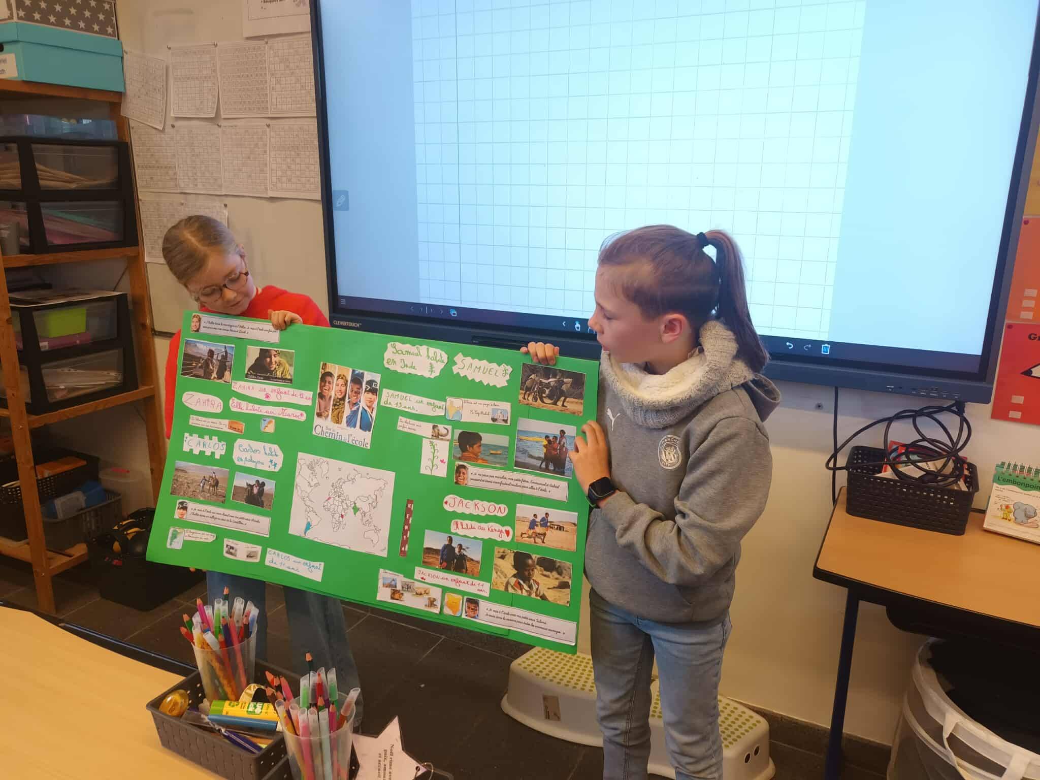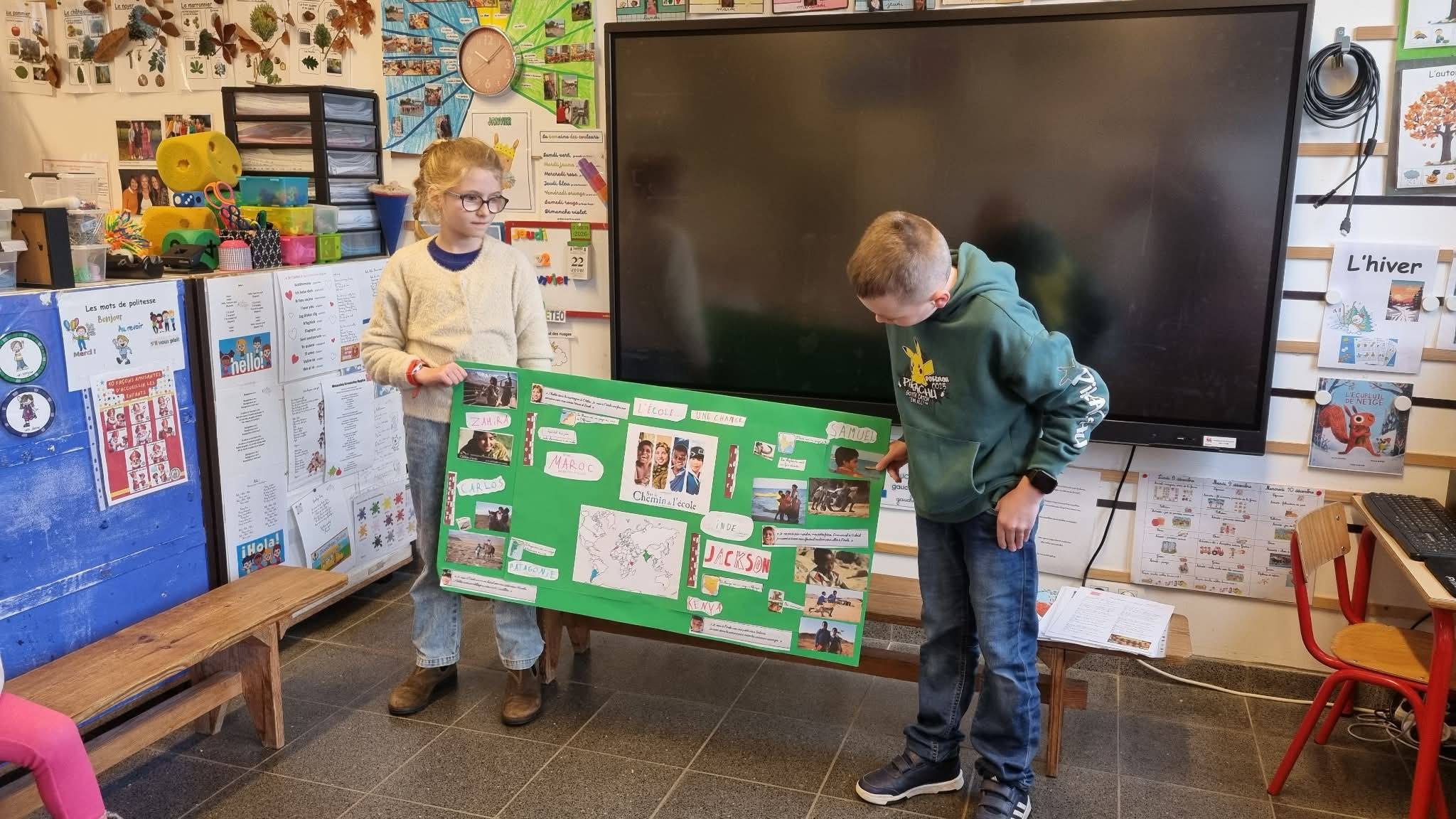 Après avoir visionné le film Sur le chemin de l’école, les élèves de quatrième primaire ont découvert le courage d’enfants qui parcourent chaque jour des kilomètres pour pouvoir aller à l’école. Touchés par ces histoires vraies, ils ont créé des affiches et sont allés les présenter aux élèves des autres classes. À travers ces échanges, ils ont expliqué le courage de ces enfants et lancé une récolte solidaire de brosses à dent, dentifrice, sparadraps et de bics afin de leur venir en aide via un ami médecin en partance pour une de leur région.